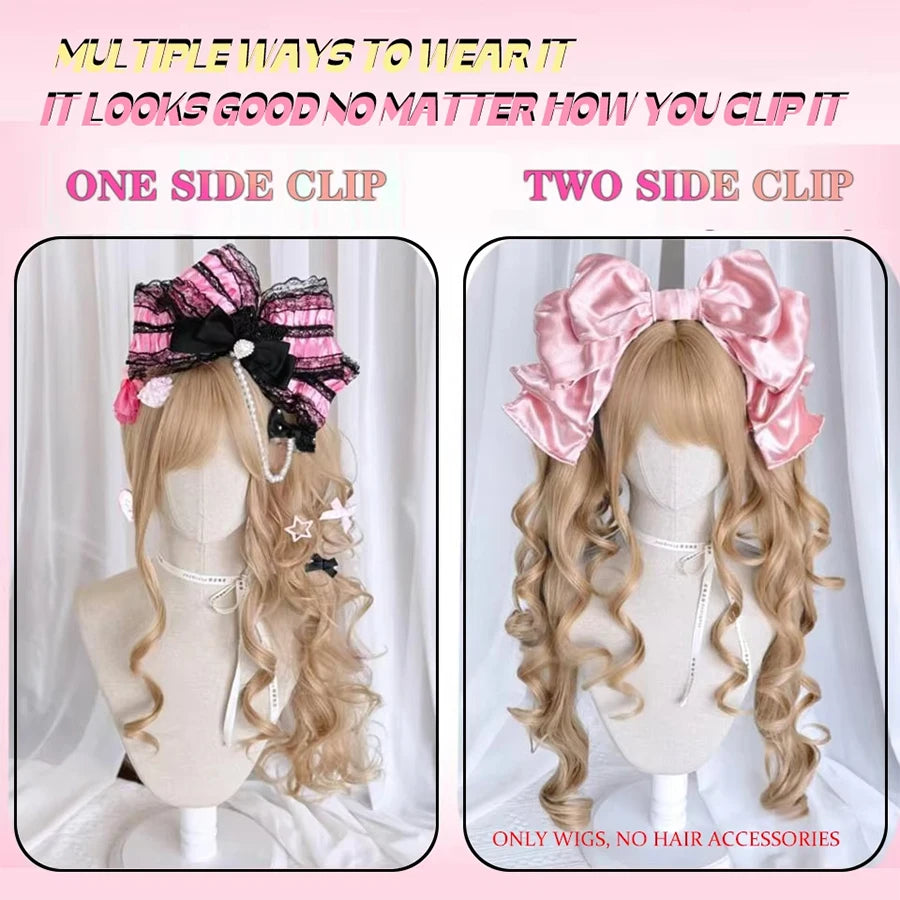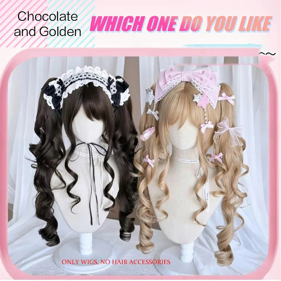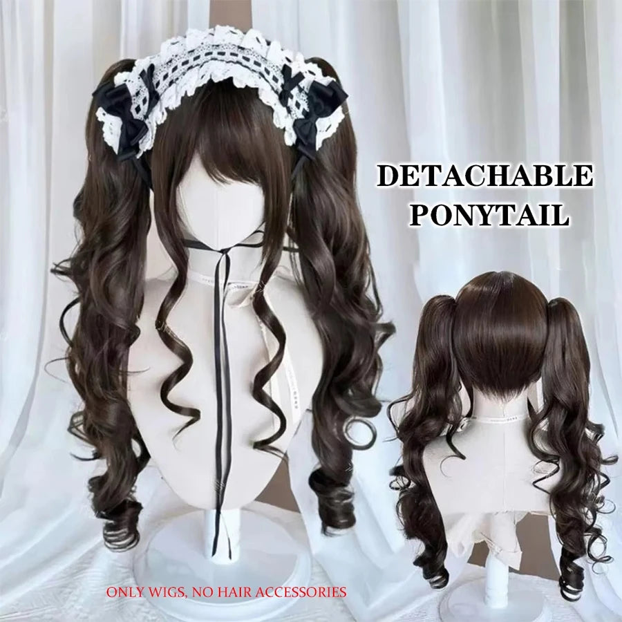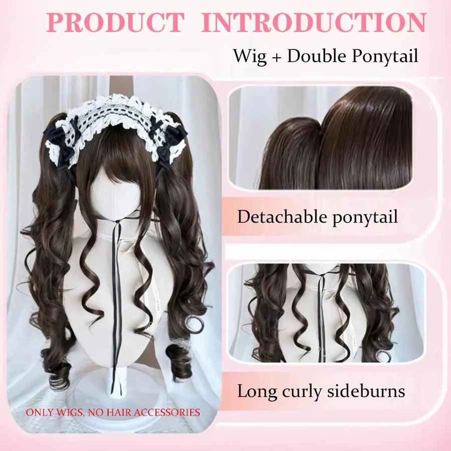 Cosplayperuk med dubbla tofsar – lång vågig syntetperuk för lolita, fest & kawaii-stil